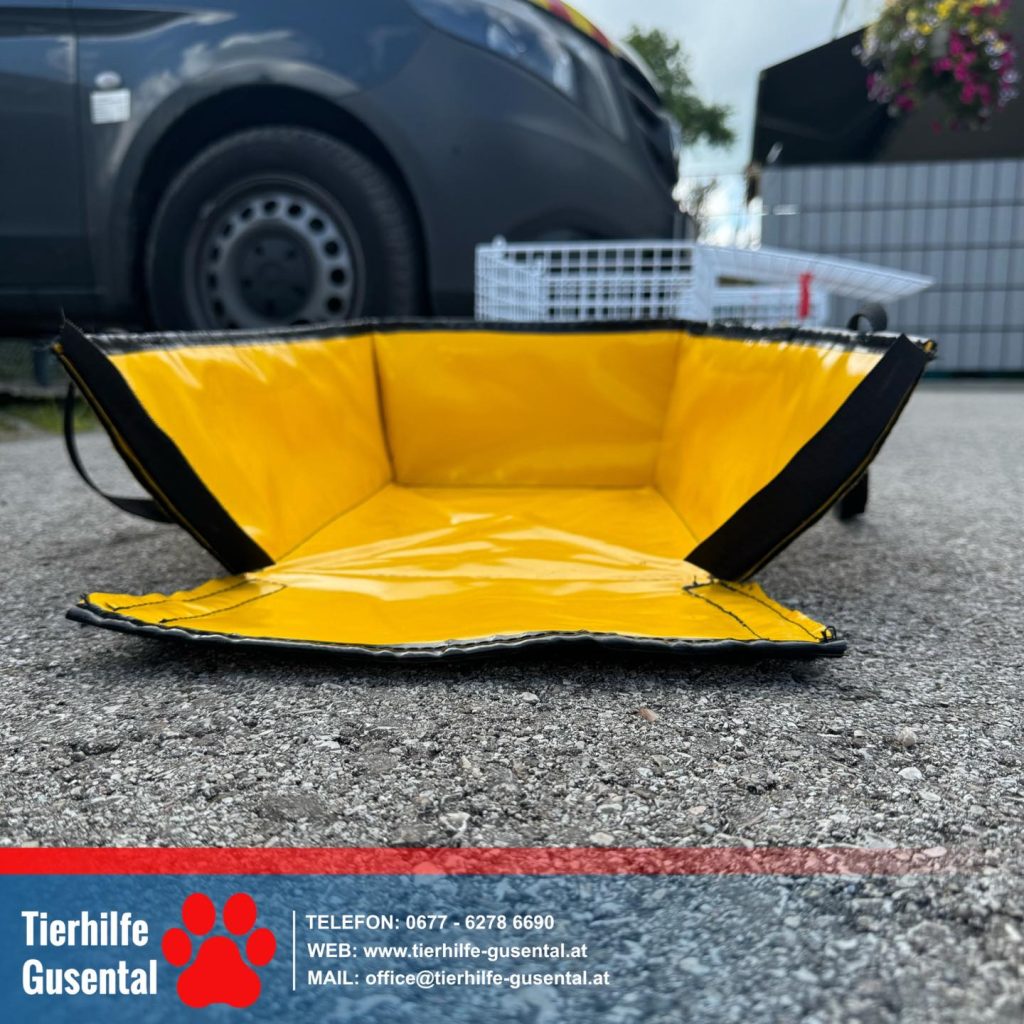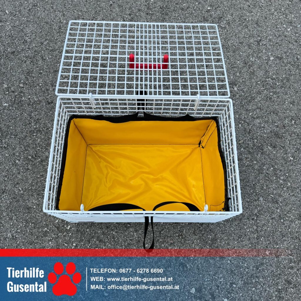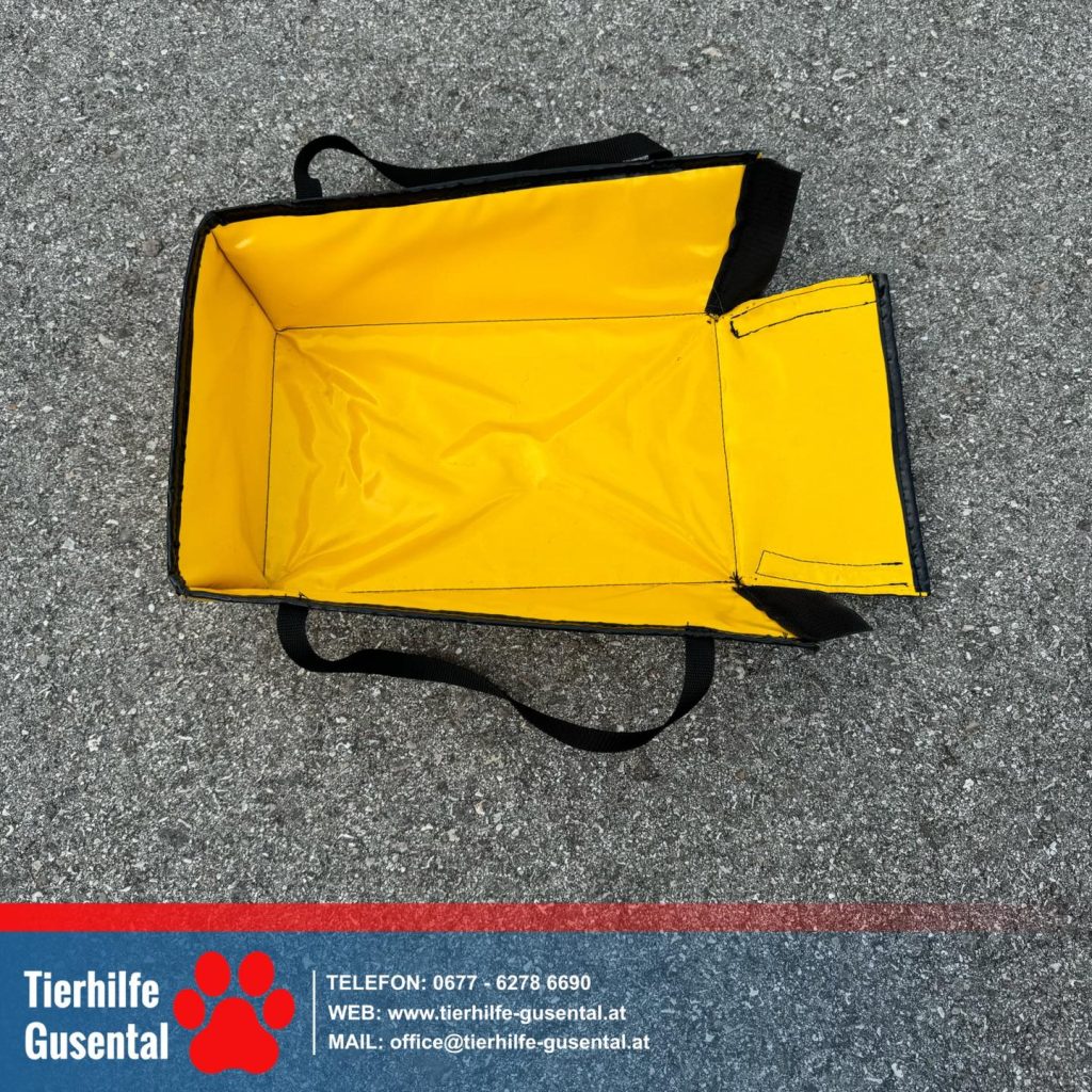 Sie kann auf einer Seite geöffnet werden damit die Katze schonend direkt vom Boden in die Tasche umgelagert werden kann, ohne das Tier anheben zu müssen. Die Tasche wird anschließend wieder verschlossen und die Tasche samt Patient in einen Käfig gegeben. Der Körper wird während des umlagerns stabilisiert und das Risiko auf weitere Verletzungen stark reduziert.