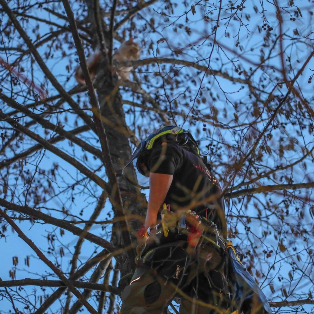 Einer unserer Baumkletterer machte sich sofort auf den Weg nach oben, erreichte den verängstigten Stubentiger und konnte ihn sicher sichern. Anschließend wurde die Katze wohlbehalten zu Boden gebracht.
