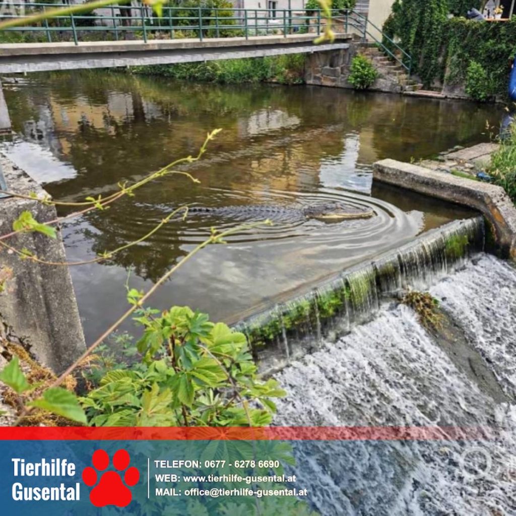 Vor Ort bestätigte sich die Lage – ein Krokodil trieb ruhig in der Gusen und beobachtete aufmerksam das Ufer.