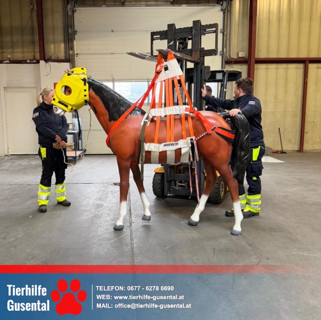 Mithilfe von sogenannten „verlängerten Armen“ und „Durchzugshaken“ konnten wir an Pferdinand realitätsnah üben, wie verunfallte Tiere schonend und sicher gerettet werden. Diese Hilfsmittel ermöglichen es, aus einem sicheren Abstand – insbesondere im Gefahrenbereich der Beine – zu arbeiten.